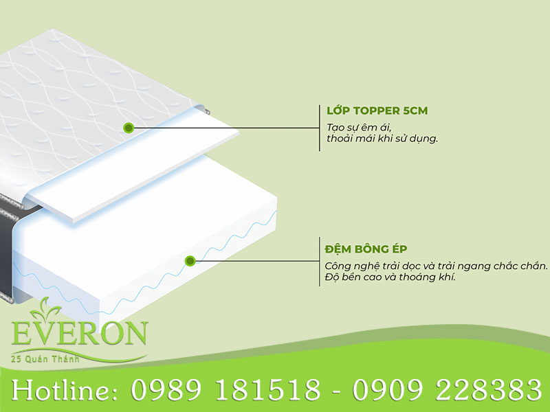 Kết luận: Nếu ngân sách cho phép, việc đầu tư vào một chiếc đệm bông ép Everon được xem là một khoản "đầu tư thông minh". Bởi lẽ, thay vì phải thay đệm mới sau mỗi vài năm do hiện tượng trũng lún, một chiếc Everon chính hãng có thể đồng hành cùng gia đình bạn hơn 10 năm mà vẫn giữ nguyên khả năng bảo vệ sức khỏe.
