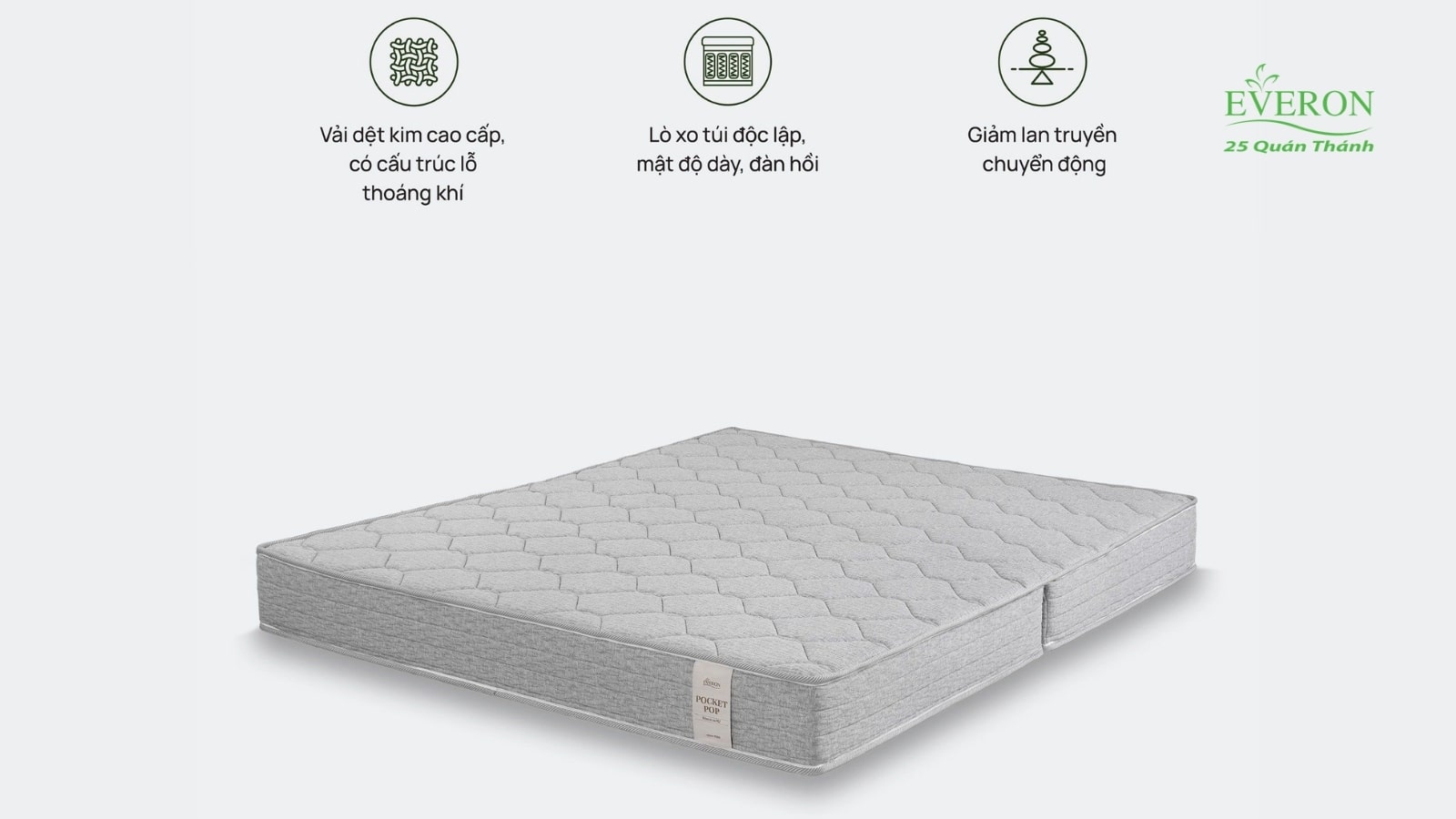 Chất lượng nệm Everon được chứng nhận bởi các tiêu chuẩn quốc tế như ISO 9001, Oeko-Tex. Mức giá tham khảo từ 8-25 triệu đồng tùy theo kích cỡ và dòng sản phẩm, đảm bảo giá trị đầu tư lâu dài cho gia đình.